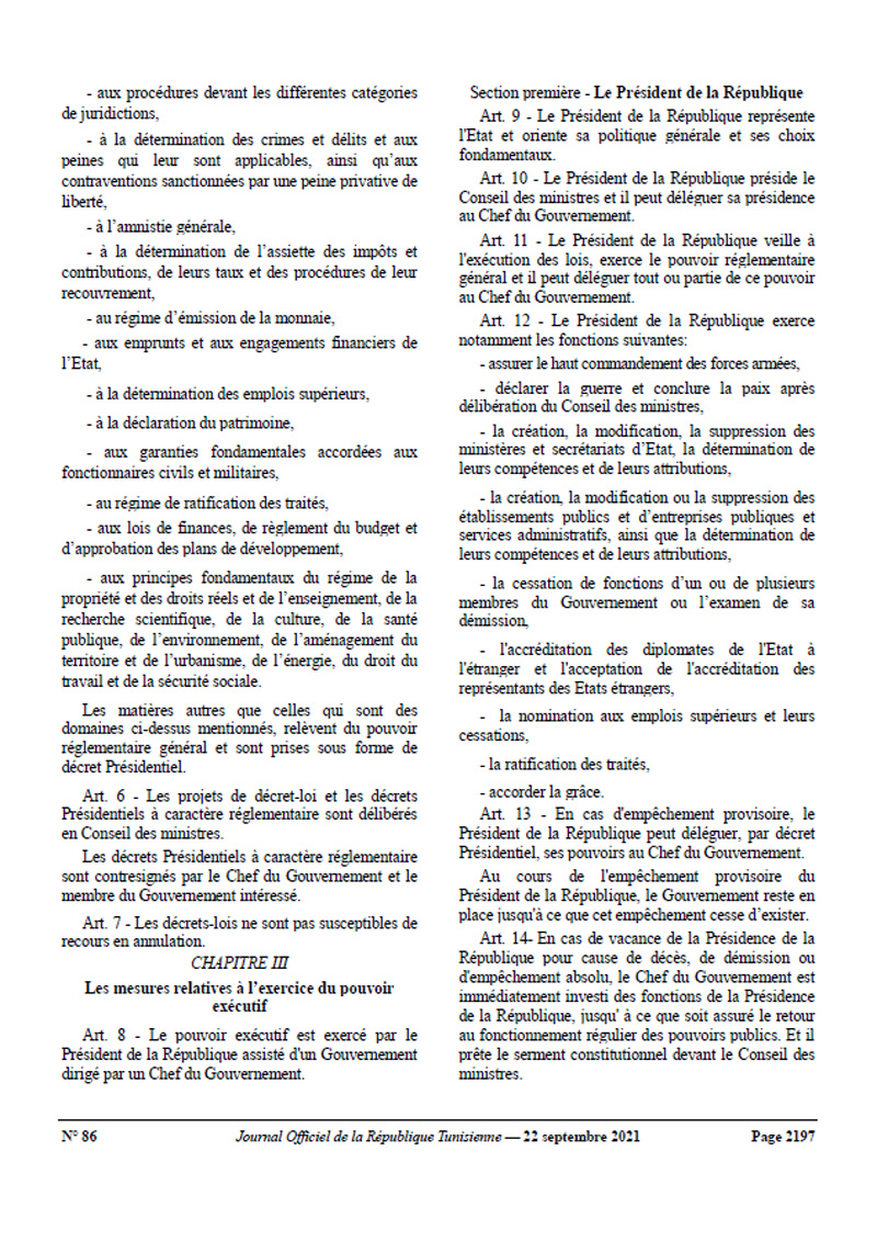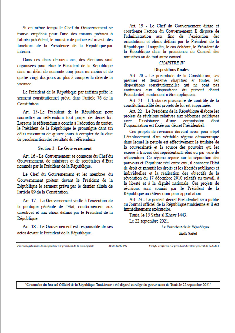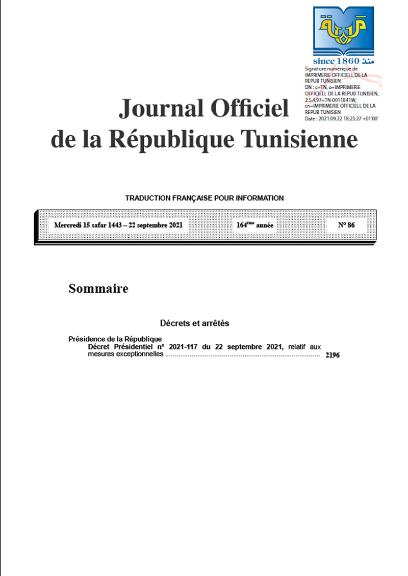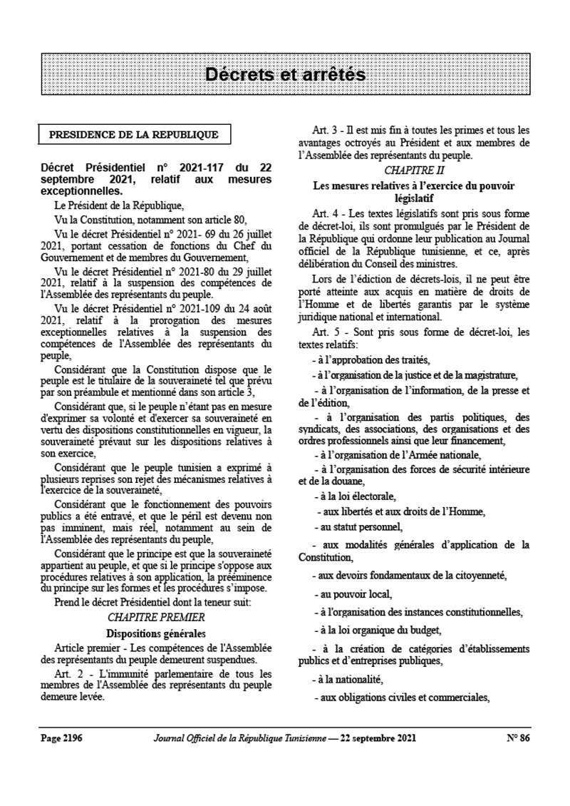 Präsidialdekret Nr. 2021-117 des Präsidenten der Republik, Kaïs Saïed, vom 22. September 2021 über Sondermaßnahmen, veröffentlicht im Amtsblatt der Republik Tunesien (JORT) Nr. 86 vom 22.09.2021. Kaïs Saïed wird für die Bereiche Justiz und Justizwesen, Information, Presse und Verlagswesen, politische Parteien, Gewerkschaften, Verbände, Organisationen und Berufsverbände sowie deren Finanzierung zuständig sein. Die Maßnahmen sehen von vornherein vor, dass Kaïs Saïed ausnahmslos alle Befugnisse erhält.