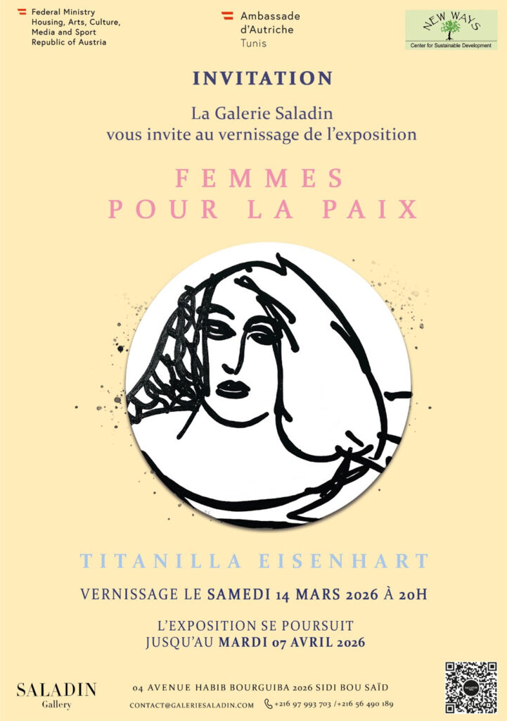 Die österreichische Botschaft freut sich, Sie zur Vernissage der Ausstellung der österreichischen Künstlerin Titanilla Eisenhart mit dem Titel „FRAUEN für den FRIEDEN” einzuladen! Diese findet am Samstag, den 14. März 2026, ab 20 Uhr, in der Galerie Saladin, Sidi Bou Saïd, statt.